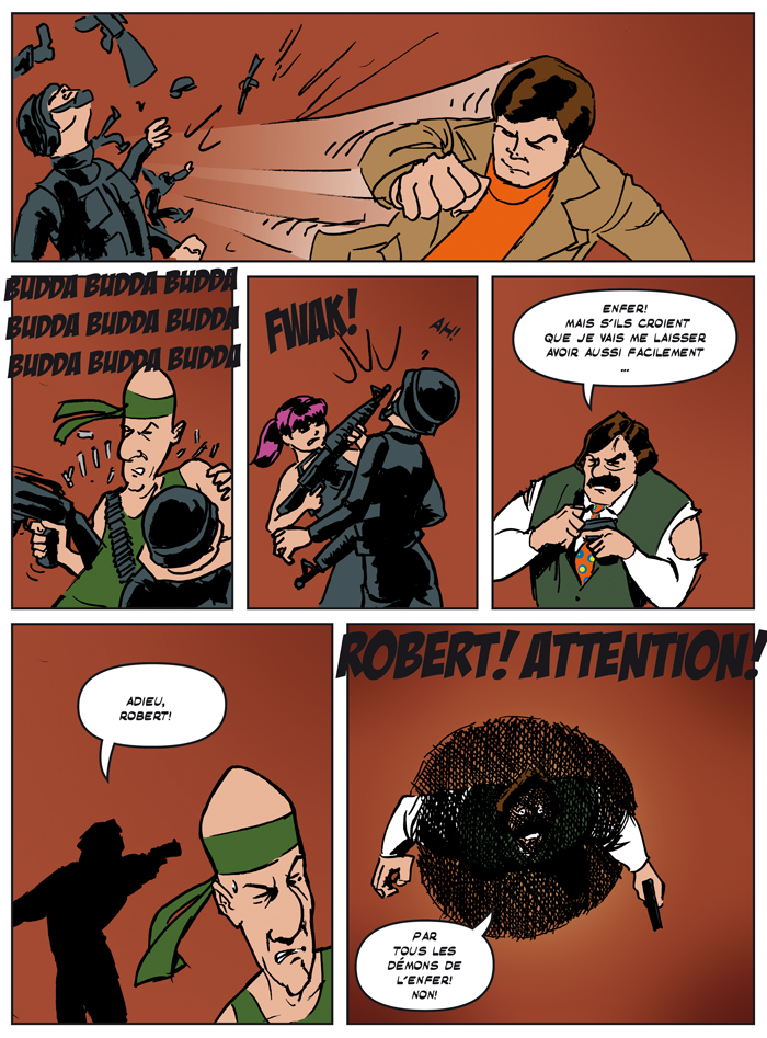 ça fiat des années que je me demande comment les dessinateurs de comics ont pu penser un jour qu'une mitraillette faisait "budda budda"... non mais sérieux, ça tire des balles en mousses ou je sais pas... ça fait plus du "takatak" ou un truc du genre! Etrange... mais joli clin d'oeil soit dit en passant! ;)